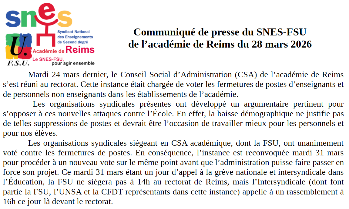 Vous êtes ici : Accueil Actualités / Action Actualité Communiqué de Presse 28 03 2026 sur les moyens et la grève du 31 mars 2026 28 mars 2026 Actualités / Action Communiqué de Presse 28 03 2026 sur les moyens et la grève du 31 mars 2026 Partager l'article sur Facebook Partager l'article sur Twitter Partager l'article via Addthis Imprimer l'article Envoyer l'article par email